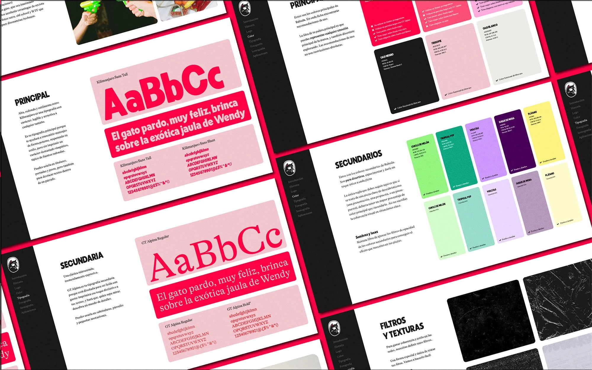 Toda la identidad visual de Rabuda gira en torno a un elemento que no solo la representa, también la diferencia: los contrastes y la capacidad para canalizarlos, exprimirlos y aprovechar hasta la última gota. Para acompañar a nuestro amigo, elegimos una tipografía de aire retro, simpática y fresca, y le dimos una paleta de colores deliciosamente noventera encabezada por un trío ganador: Rojo rabudo, rosa boomer y chicle de melón.